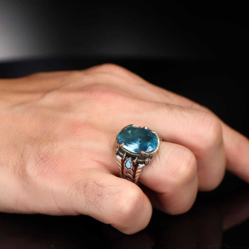 سلسلة سلسلة 925 خاتم فضة للرجال من حجر التوباز الأزرق