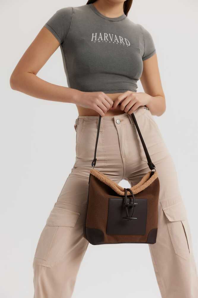 Plush Detail Suede Bitter Coffee Shoulder Bag