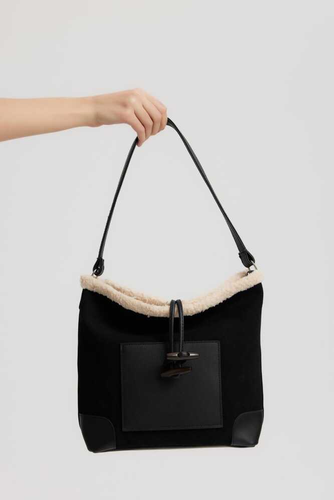 Product FeaturesDimensions:Length: 25 cmWidth: 33 cmWidth: 10 cmStrap Length: 25 cmUsage Area: Hand, ShoulderMaterial: Suede FabricInner Part is Lined and Consists of a Single Compartment.Made of Durable Metal Accessory.Button Closure.