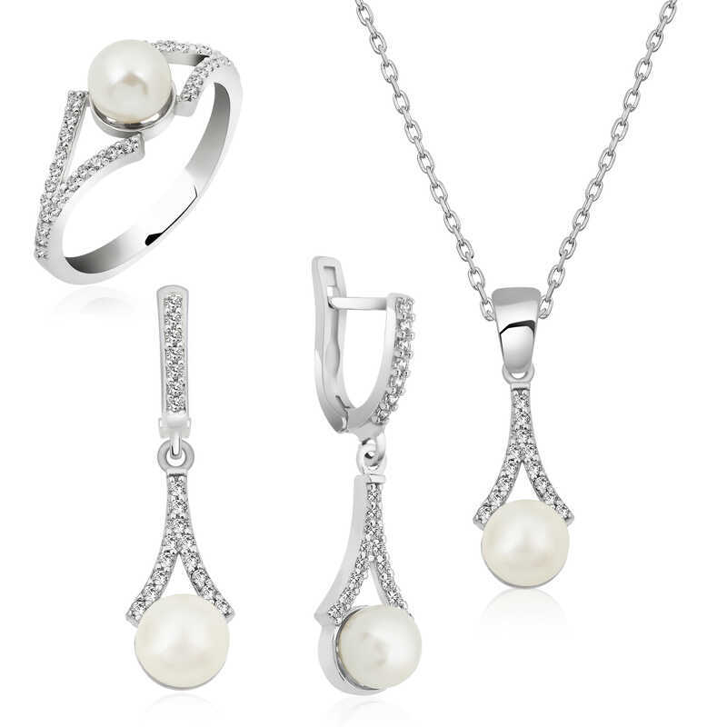 Silver Pearl Women's Set Pearl, which will never go out of fashion, is reinterpreted in different styles with today's jewelry. The eye-catching sparkle of pearls and baguette will surround you, too. This silver set, which you and your loved ones will enjoy wearing, will also be one of the best gifts with which you can share your love. It is made of 925 sterling silver. It is rhodium plated on silver. Rhodium plated products retain their shine for a long time and oxidation is delayed. The average chain length is 45 cm. The stones on it are baguettes and cultured pearls. As with all silver sets, the silver pearl women's set is also produced by hand. Due to silver and precious stones, there may be a deviation of ± 10% in the stated average product weight. Width: 1.50 cm Height: 2.80 cm Average Weight: 8.7 gr.