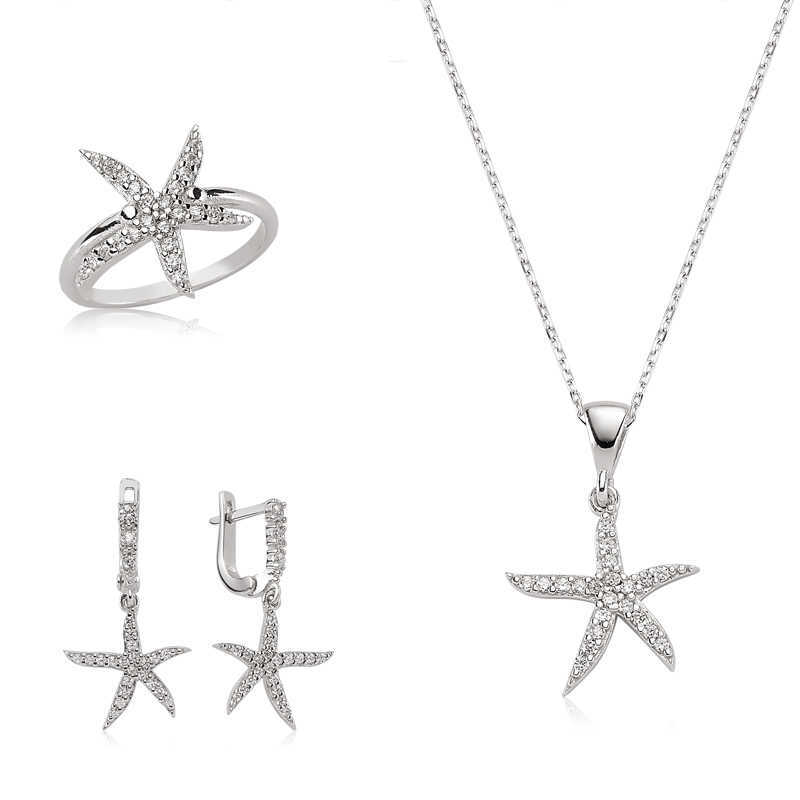 Silver Starfish Women's Set Starfish; It symbolizes divine love, divine guidance, inspiration, brightness and hope. May your soul be filled with hope and love with the starfish that fell from the sky into the seas. Silver starfish set is a gift option that anyone who wants to make their wife, mother, girlfriend, daughter or friend happy can buy. It is made of 925 sterling silver. It is rhodium plated on silver. Rhodium plated products retain their shine for a long time and oxidation is delayed. The stones on it are zircon. The average chain length is 45 cm. All of our products are produced by hand. Due to silver and precious stones, there may be a deviation of ± 10% in the stated average product weight. Cover. Weight: 9.00 gr.