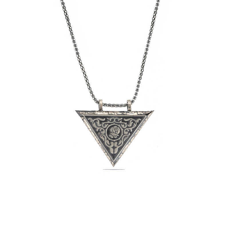 Silver Triangle Openable Rose Amulet Necklace Rose; It is the most love-scented flower among all flowers. Rose is the most effective way to express your love with the most special feelings... We use flowers, especially roses, to convey many emotions such as Love, Kindness and Happiness to each other. The rose is a perfect emblem of innocence, loyalty and purity. This necklace created with spirituality; It is made of 925 sterling silver. Oxide coating is applied on the necklace. Like other silver necklaces, the silver rose amulet necklace is also produced entirely by hand. Due to silver and precious stones, there may be a deviation of ± 10% in the stated average product weight. Product Length: 5.00 cm. Product Width: 6.00 cm. Chain Length: 55.00 cm. Cover. Weight: 23.75 gr.